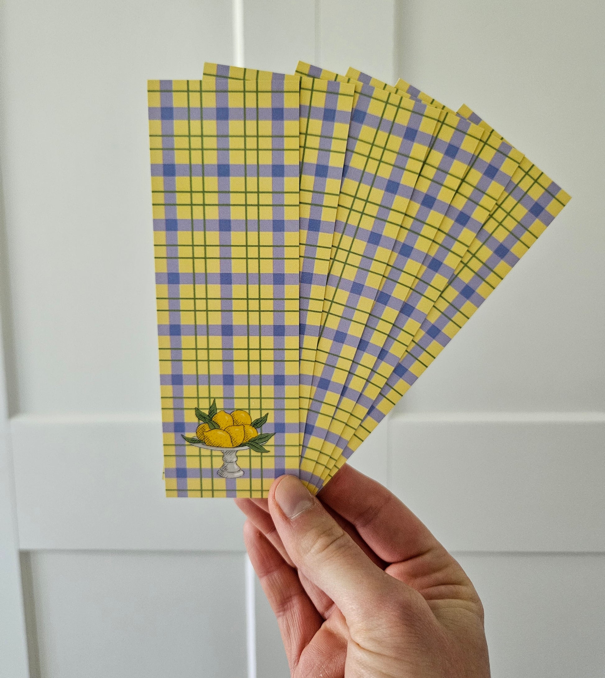 Ce marque-pages aux couleurs du tartan mauve et jaune du tome 5 est bien plus qu'un simple accessoire. C'est un voyage au coeur d'un concours de pâtisseries qui sent bon le citron, au sein du château de Bilbury Lane 🍋