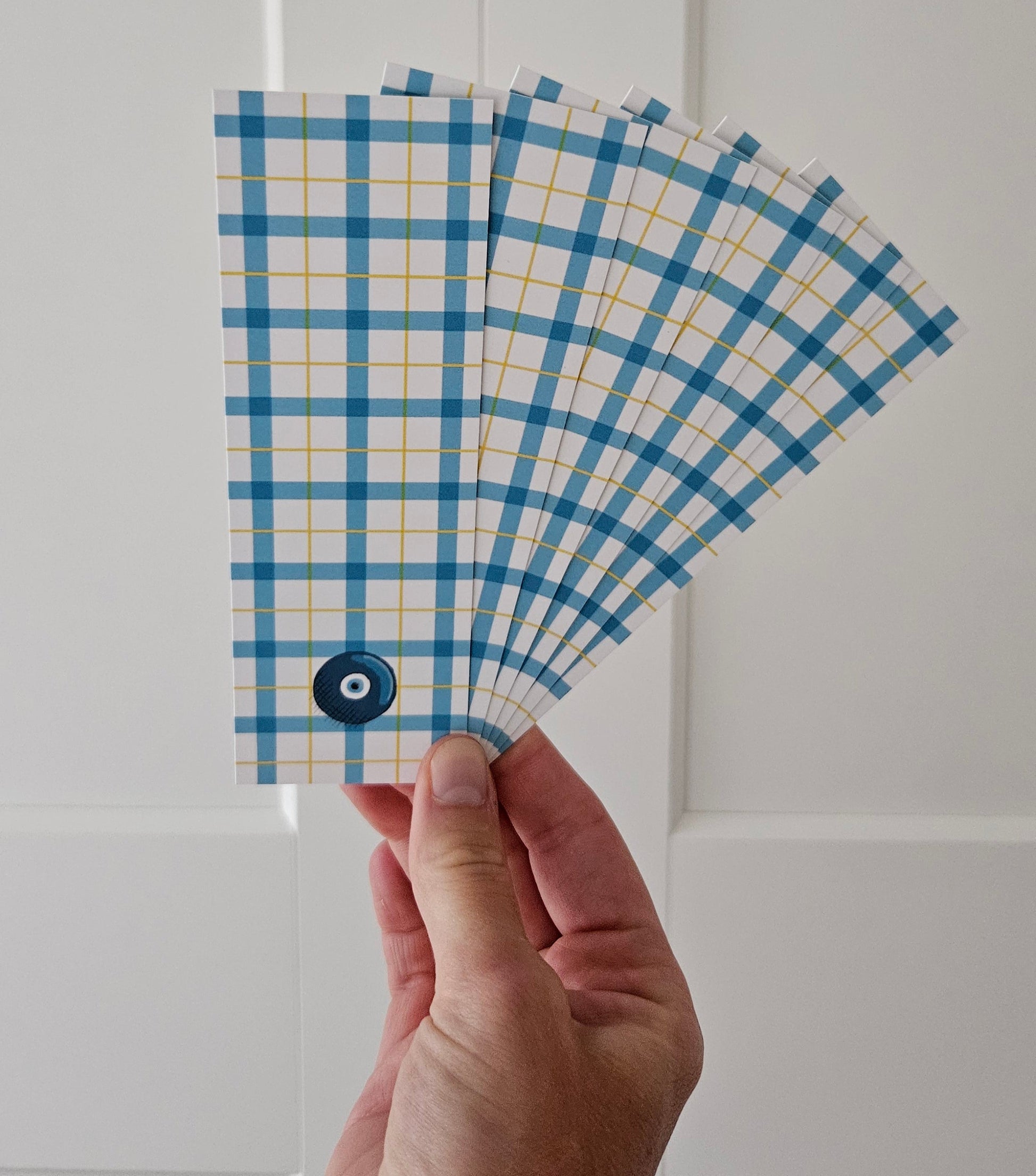 Ce marque-pages aux couleurs du tartan bleu et blanc du tome 6 est bien plus qu'un simple accessoire. C'est un voyage entre Écosse et Grèce. Une parenthèse salée sous l'oeil bienveillant des dieux de l'Olympe, entre ouzo, mariage et enquête, sur l'île de Naxos. 🧿